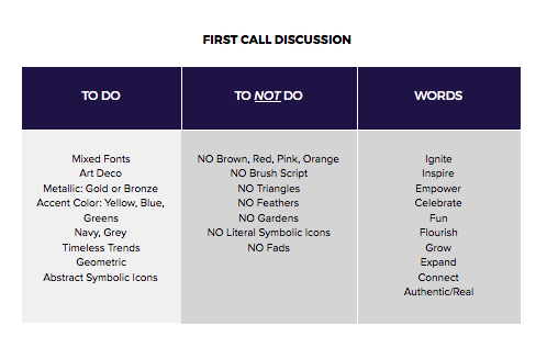 In preparation for the creative call I have clients create a Pinterest Board of inspiration for their needs. Here is an example of a Pinterest Board a client created for me for their logo design. This helps me have an understanding of what the client is looking for before the first call.